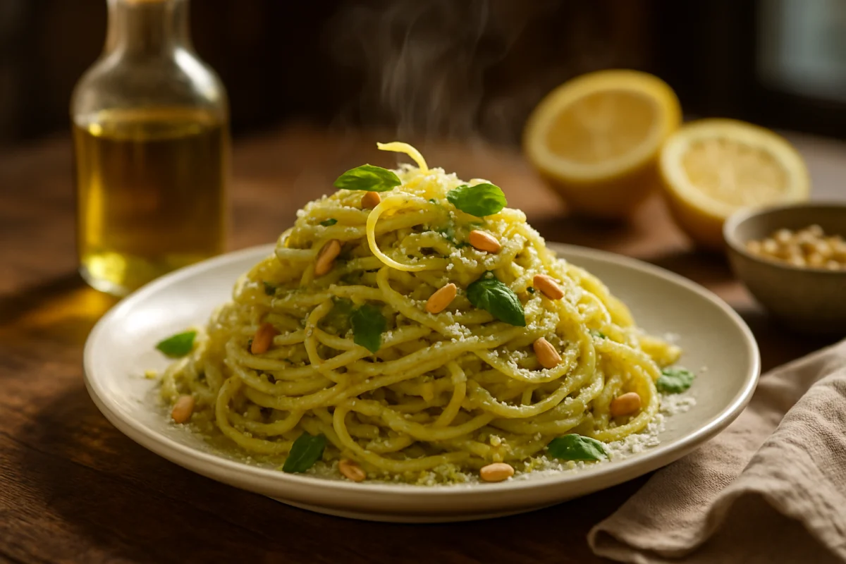 Per due persone ti servono: 180-200 g di pasta (spaghetti, linguine o trofie), 1 limone non trattato (buccia e succo), 30-40 g di pinoli o mandorle tostate, 30 g di Parmigiano Reggiano grattugiato, 1 spicchio d’aglio (opzionale), 4-5 cucchiai di olio extravergine d’oliva, sale e pepe q.b. Se vuoi una versione vegana sostituisci il Parmigiano con lievito alimentare o con una crema di anacardi, che darà corposità. Per una nota erbacea puoi aggiungere foglioline di basilico o prezzemolo; il basilico crea un ponte aromatico con il limone simile al classico pesto ligure, mentre il prezzemolo mantiene il sapore più neutro. Per chi preferisce un tocco più ricco, un cucchiaio di panna da cucina o una piccola quantità di burro a fine mantecatura rendono la salsa più vellutata. Se vuoi approfondire le origini e la storia del pesto, fai riferimento alla voce su Wikipedia che racconta l’evoluzione di questa salsa tradizionale: Pesto su Wikipedia.